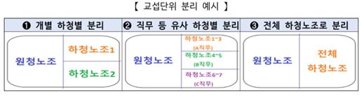 한편, 노동위원회의 교섭단위 분리 과정에서 원청노조와 하청노조는 교섭권의 범위, 사용자의 책임 범위, 근로조건, 이해관계 등에서 서로 차이가 있으므로 원칙적으로 원청노조와 하청노조 간에는 교섭단위를 분리하고 이후 하청노조 간 교섭단위를 분리함에 있어서도 원청 사용자와 하청노조가 합의한 사항은 최대한 존중하여 반영하되, 노·사간 의견이 불일치되는 경우에는 하청노조의 교섭권을 실질적으로 보장하고 안정적 교섭체계를 이룰 수 있는 방향으로 교섭단위 분리제도를 운영할 계획이다. 예를 들어, ➊ 직무나 이해관계, 노동조합 특성이 현저히 다른 경우에는 개별하청별로 분리하는 방식, ➋ 직무 등 특성이 유사한 하청이 있는 경우에는 유사 하청별로 분리하는 방식, ➌ 전체 하청의 직무 등 특성이 유사한 경우는 전체 하청노조로 분리하는 방식 등 합리적인 방식으로 교섭단위 분리를 통해 하청노조의 교섭권을 실질적으로 보장한다.