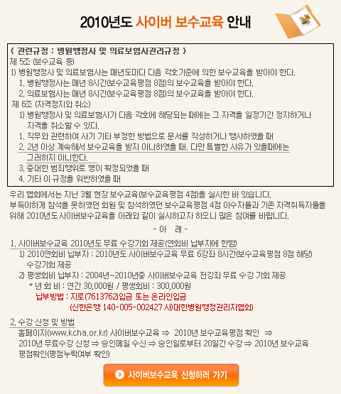 2010년도 사이버 보수교육 안내 등록자 : 관리자 조회 : 4577 등록일 : 2010-04-15 00:00 목록 이전글 다음글 이동 다음글 2010년도 병원행정CEO아카데미*병원경영진단사과정 이전글 입찰공고<완료>