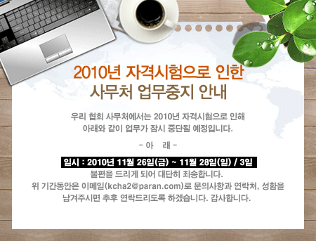 협회 사무처 임시 휴무 안내 등록자 : 관리자 조회 : 715 등록일 : 2010-11-25 00:00 목록 이전글 다음글 이동 다음글 "제5회 병원경영진단사" 자격시험 공고 이전글 사이버 장기연수 23주차 동영상 업로드