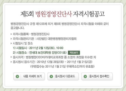 "제5회 병원경영진단사" 자격시험 공고 등록자 : 관리자 조회 : 1723 등록일 : 2010-12-28 00:00 목록 이전글 다음글 이동 다음글 2010년 병원행정사 및 의료보험사 자격시험결과 발표 이전글 협회 사무처 임시 휴무 안내