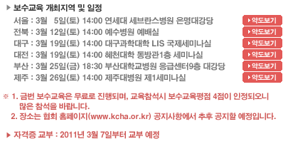 2011년 보수교육 일정 및 장소공지 (2010년 11월 28일 자격시험 합격자) 등록자 : 관리자 조회 : 5465 등록일 : 2011-02-24 00:00 목록 이전글 다음글 이동 다음글 제19회 병원행정 장기연수과정 연수생모집 이전글 2011년도 정기대의원총회 공고