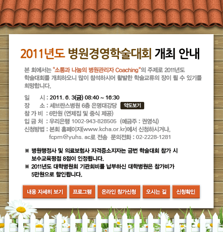 2011년도 병원경영학술대회 개최 안내 등록자 : 관리자 조회 : 1396 등록일 : 2011-04-20 00:00 목록 이전글 다음글 이동 다음글 제19회 병원행정 사이버 장기연수과정 개강 안내문 이전글 2011년도 사이버 보수교육 안내