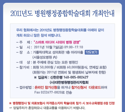 병원행정종합학술대회 개최안내 (보수교육8점인정) 등록자 : 관리자 조회 : 3040 등록일 : 2011-09-15 00:00 목록 이전글 다음글 이동 다음글 사이버 장기연수 18주차 동영상 업로드 이전글 사이버 장기연수 17주차 동영상 업로드