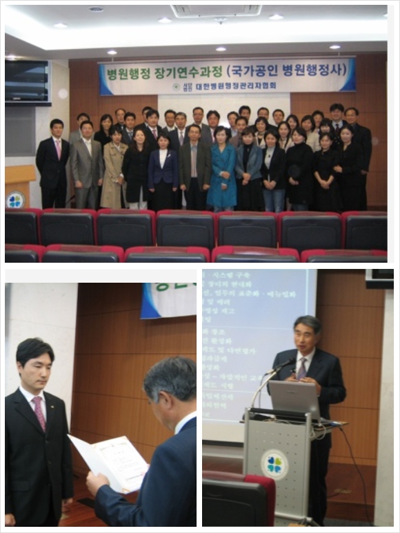 협회는 10월 22일(월) 경희대학교 동서신의학병원에서 '병원행정장기연수과정'수료식을 개최했다. 총 35명의 수료생이 참석했으며 대표로 김성민(서울아산병원), 백미경(경희대 동서신의학병원)이 수료증을 받았다. 이날 임배만 회장은 "지난 5개월 동안 수업듣느라 고생 많았고 11월 25일에 있을 병원행정사 자격시험에도 좋은결과 있기를 바란다"고 연수생을 격려했다. 병원행정사 인천과정 수료식은 10월 25일에 진행될 예정이다. 병원행정장기연수과정은 회원의 자질을 향상시켜 병의원의 핵심역량을 강화 하는데 기여함을 목적으로 1993년 개설되어 올해로 15회를 맞이하고 있다. 교과과정은 보건복지부, 건강보험심사평가원, 한국병원경영학회, 보험심사간호사회, 전국병원홍보협의회 등의 보건 유관단체의 추천을 받아 최고의 교수진을 선발하여 이론과 실무가 접목된 학습이 가능하도록 하고 있다. 교육내용은 ▶의료기초 ▶경영기획 ▶조직 및 인적자원관리 ▶재무 및 물적자원관리 ▶원무,보험관리 ▶마케팅 및 질 관리 ▶정보관리(병원전산)등 부서별 핵심과정을 종합했다. 연수과정은 매년 500여명이 수강하고 있으며 행정직을 비롯해 의료일선에 근무하는 기사와 간호사들도 ‘병원행정장기연수과정’에 대한 관심과 수요가 꾸준히 증가하고 있다. 장기연수과정은 병원행정(경영, 회계)의 전반적인 흐름을 이해할 수 있어 병원에 근무하는데 많은 도움이 되고 있다.