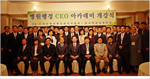 2008년도 병원행정CEO아카데미*경영진단사과정 힘찬 출발 현실적인 경영전략 수립을 위한 토의와 사례중심 강의로 차별화 '인기' 사단법인 대한병원행정관리자협회(회장 임배만)가 한국병원경영학회와 공동으로 개설한 '‘병원행정CEO아카데미* 경영진단사과정(이하 CEO과정)’이 26주간의 일정으로 문을 열었다. 5월 19일 김강립 보건복지가족부 보건의료정책과장의 특강을 시작으로 진행된 2008년도 CEO과정 개강식은 김태웅 수석부회장, 박영익, 송영채 부회장과 41명의 연수생이 참석한 가운데 진행됐다. 매주 월요일 저녁 서울대병원 임상의학연구소에서 이뤄지며 수강생들은 ▶ 병원행정CEO필수강좌 ▶병원경영진단 필수강좌 등 매회 2강좌씩 총 78시간을 이수하게 된다. CEO과정은 주입식 강의보다는 병원을 스스로 진단하고 분석하여 현실적인 경영전략 수립할 수 있도록 토의와 사례중심의 강의를 진행해 병원CEO가 지향하는 '경쟁력 있는 지도자'를 양성할 계획이다.