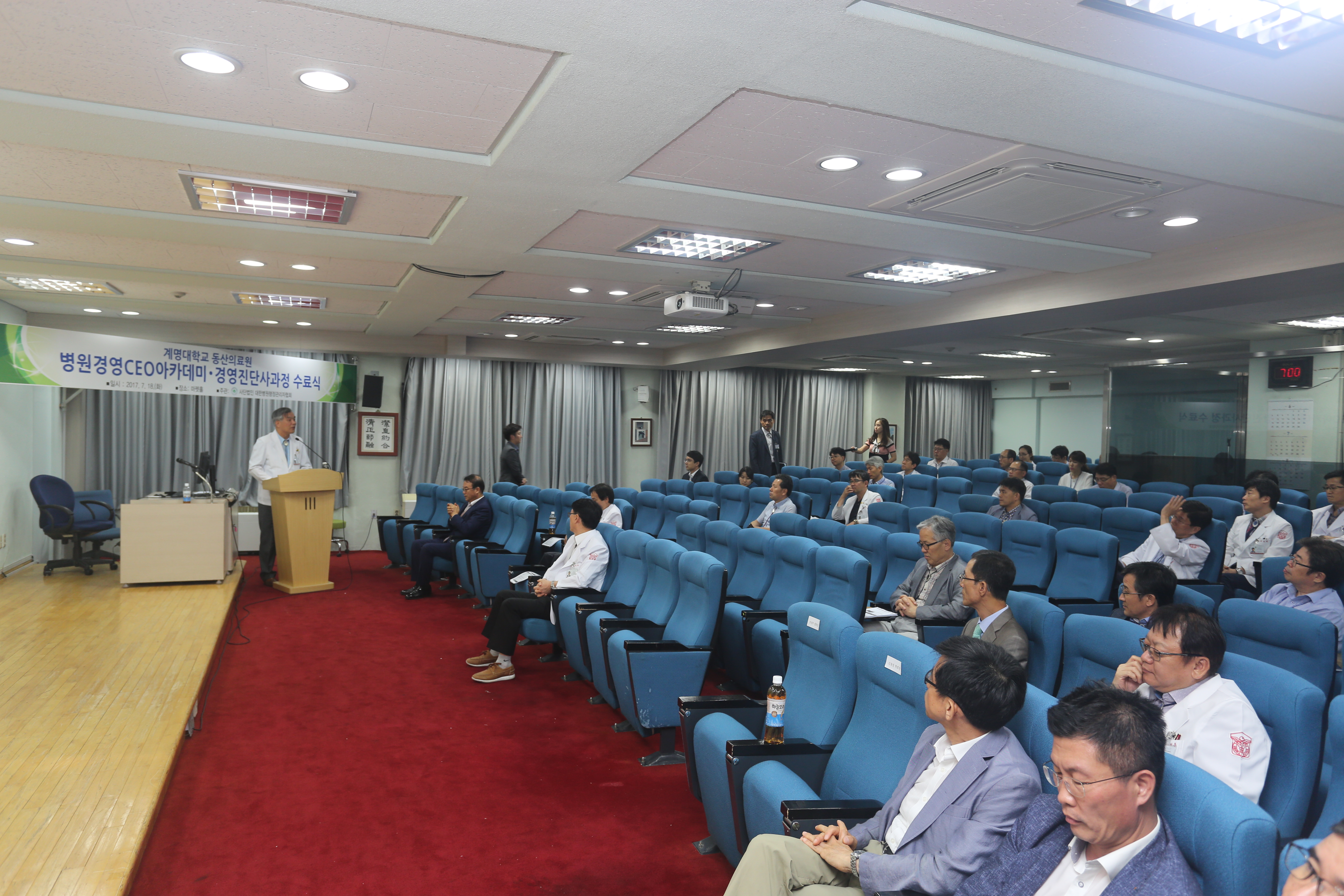병원경영CEO아카데미 대구지역 수료식이 7월 18일(화), 오후6시 계명대학교 동산의료원 강당에서 개최됐다. 이번 과정은 계명대학교 동산의료원 경영인들을 위한 전문가 교육 과정으로 계명대학교 동산의료원에서 2월 28일(화)부터 개설되어 매주1회씩 18회가 진행되었다. 김권배 동산의료원장은 인사말 통해 “급변하는 의료환경 변화에 앞서 나가기 위해 동산의료원에서 병원경영CEO 아카데미를 개설하게 됐다” 며 “의료원 보직 교수들과 행정 및 간호 책임 관리자들이 최신 보건의료정책 트렌드 및 병원경영을 위한 다양한 지식 습득을 통해 새로운 경영마인드를 가질 수 있는 계기가 되었길 바란다” 고 밝혔다. 권성탁 협회장은 인사말을 통해 “협회는 병원행정의 엘리트양성을 목표로 매년 경영진단사를 배출해왔으며, 지금까지 총 400여명의 경영진단사를 배출했다. 내년 1월에도 자격시험이 예정되어 있으며, 18주간의 본 과정이 이번 시험을 준비하는 데에도 많은 도움이 될 것이다. 여러분의 많은 지원과 좋은 결과도 함께 하기를 바란다” 고 밝혔다. 이번 '병원경영CEO아카데미․경영진단사' 과정은 동산의료원(원장 김권배 의료원장)이 대구시 달서구 성서지역에 1,033병상 새병원 오픈을 앞두고 의료진들의 경영 마인드 개선을 위해 의사 30명과 병원 행정직 및 간호사들을 대상으로 진행되었다. 이번 강의에서는 이론과 실무중심의 사례연구(Case Study), 성공한 병원경영자들의 초청강의 등으로 강의를 구성하였고, 모든 과정을 수료한 교육생은 사단법인 대한병원행정관리자협회 회장과 한국병원경영학회 회장 공동 명의의 수료증이 수여됐다.
