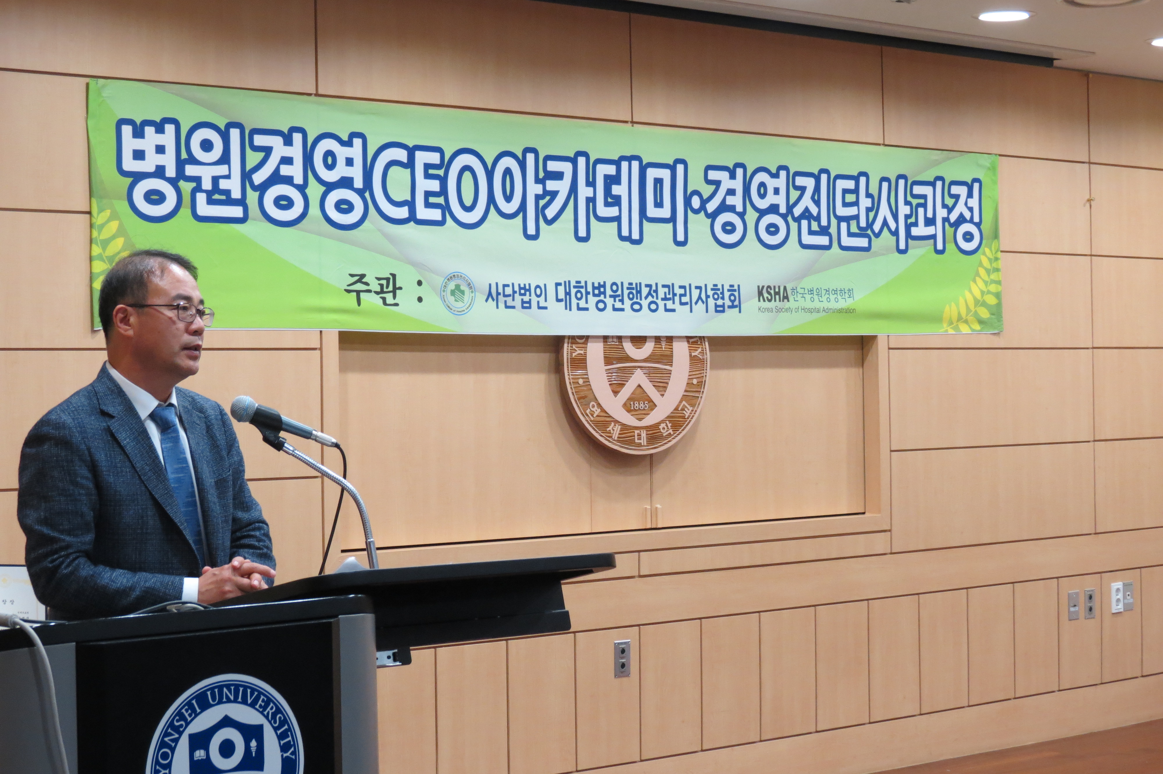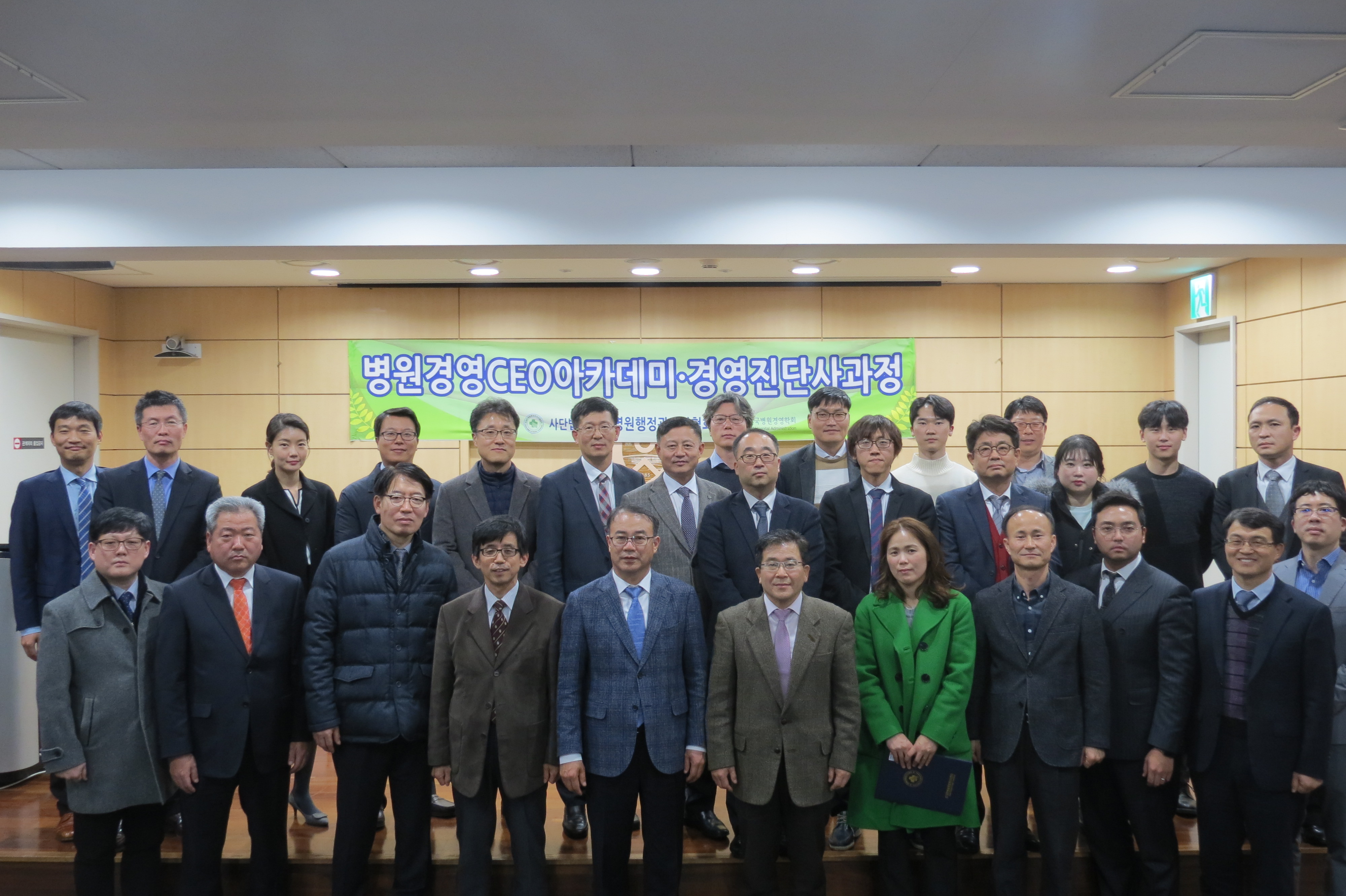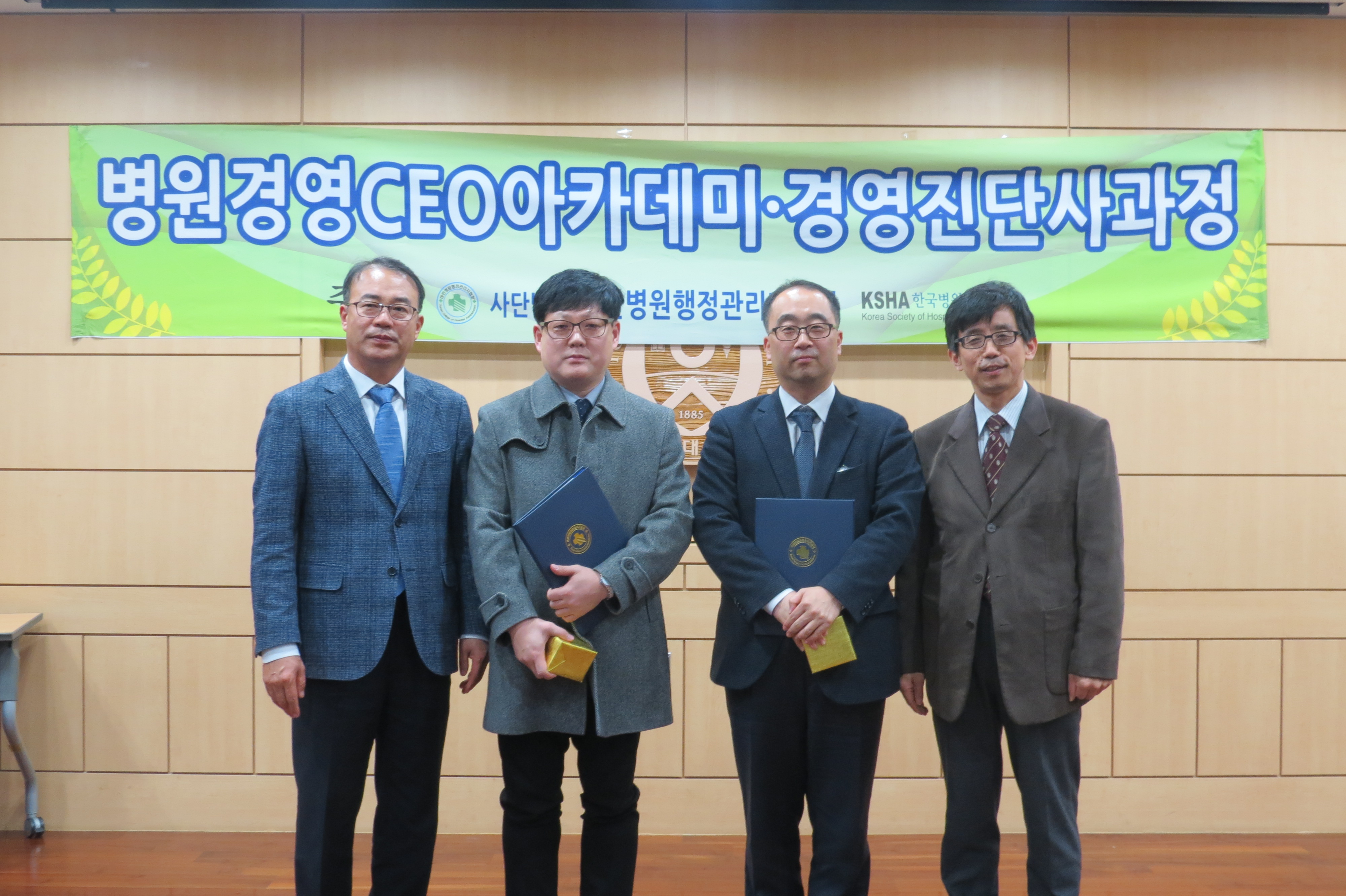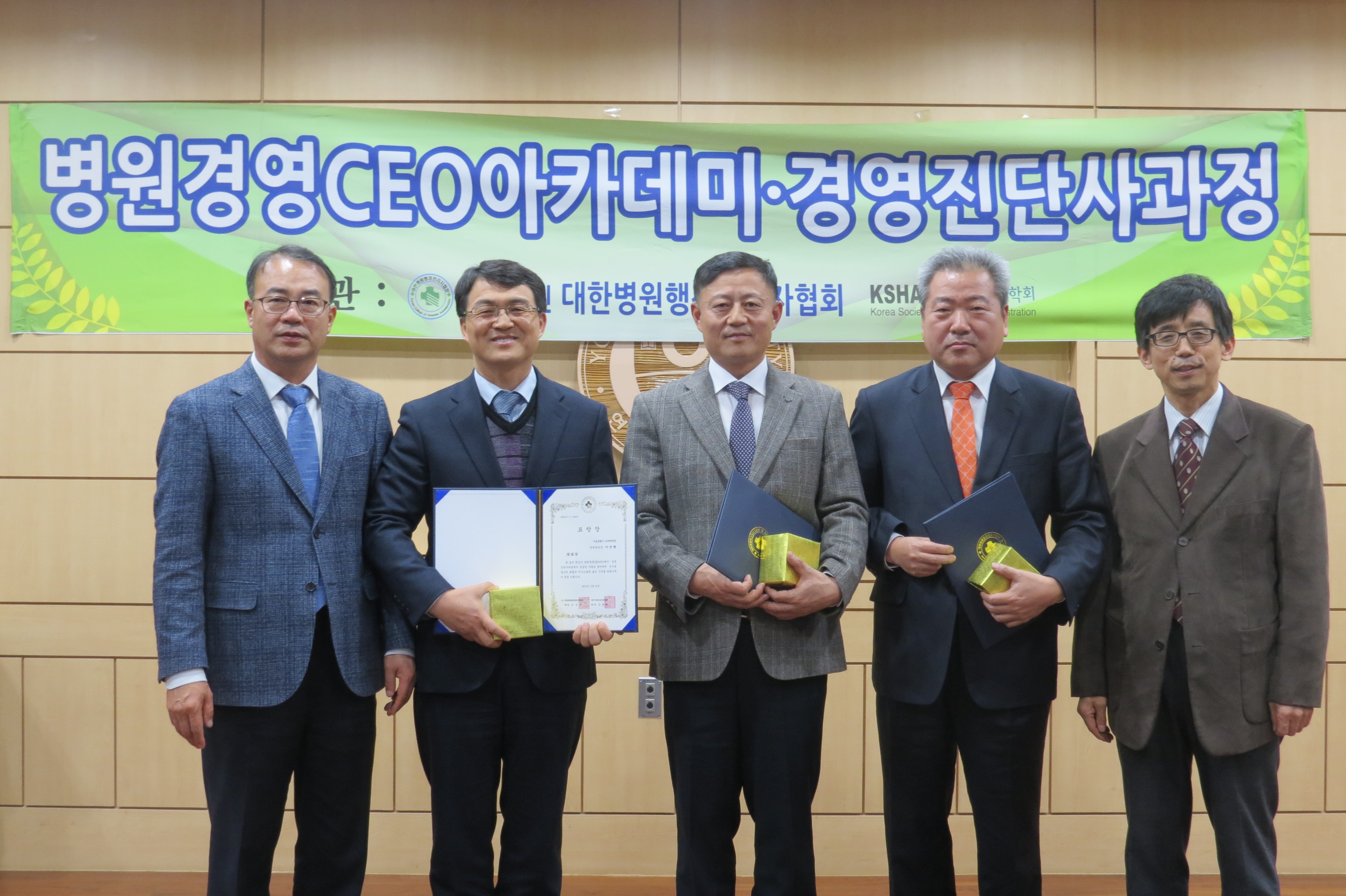 병원경영CEO아카데미 수료식이 11월 27일(월), 오후6시 연세대 보건대학원에서 개최 되었다. 이번 과정엔 28명의 연수생이 수료 했으며 표창 수상으로 서울지역에 이종훈 자치회장(경희의료원)이 공로패를 김성수(연세의료원), 우영주(<주>엔오엔병원경영컨설팅),권일찬(가톨릭대학교 성바오로병원)이 각각 모범상을 수상하였고 성기열(메디인병원), 구선완(한양대학교구리병원), 이건헌(서울특별시 보라매병원)이 성실상을 각각 수상하였다. 또한, 연구과제 발표는 최우수상은 C팀(발표자 하대관), 장려상엔 A팀(발표자 김수정)가 수상하였다.