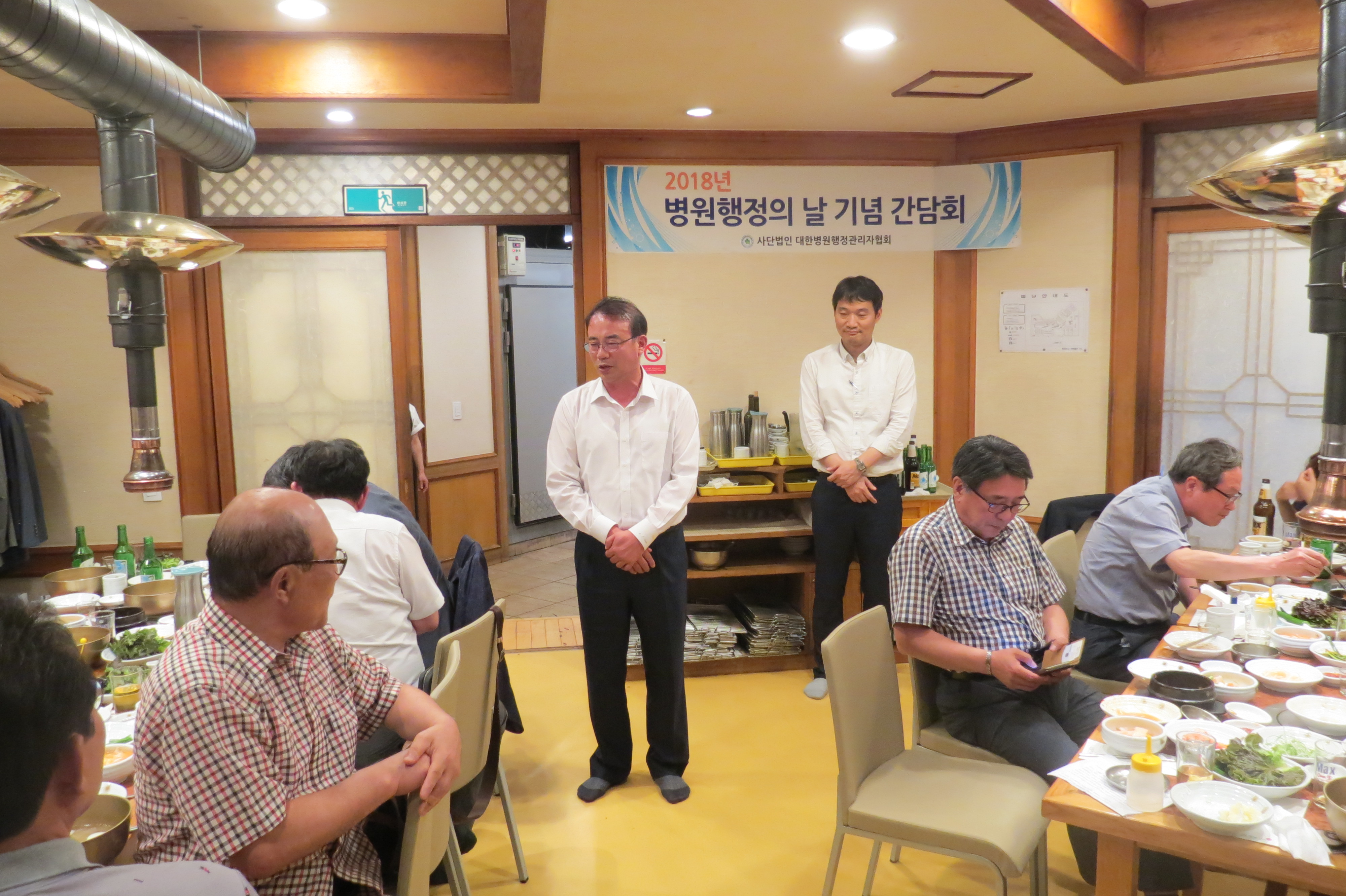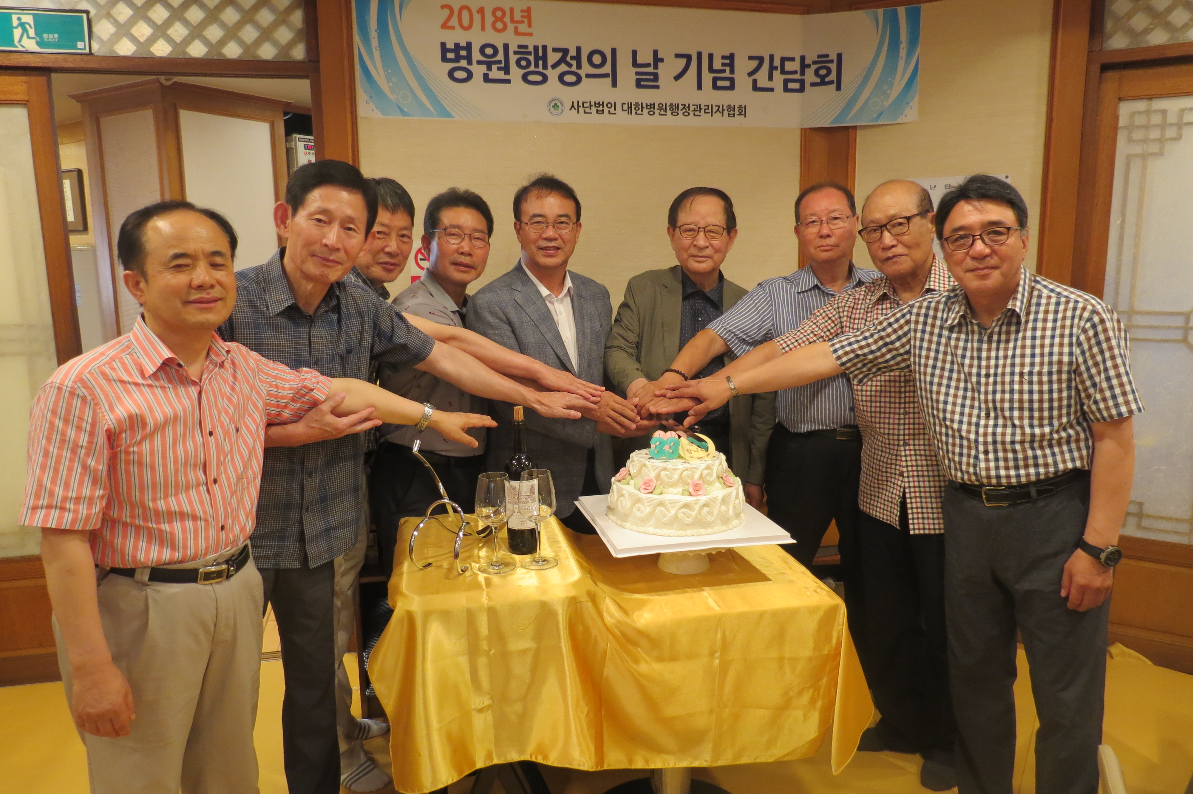 병원행정의 날 기념 간담회가 7월20일(금), 오후6시 신촌 형제갈비에서 개최 되었다. 권성탁 협회장은 인사말을 통하여 “오늘은 우리 협회의 33번째 생일을 축하하는 자리로 우리 협회가 병원행정을 대표하는 단체로서 굳건히 자리매김해 올 수 있었던 것은, 여기 계신 선배님들과 동료들이 한 마음 한 뜻으로 사심 없이 협회의 발전을 위해 노력해 왔기 때문일 것이며, 생일상을 받고 보니, 소중한 추억을 공유하는 분들이 모인 오늘 이 자리를 통해 더욱 발전하는 협회를 그려보는 소중한 시간이 되기를 바란다.”고 밝혔다. 이날 간담회는 이종길·김태웅·박영익 명예회장, 정동선 상임고문, 김소양·송영채·윤호건·조관행 고문, 정영권·이상민·권영식 부회장, 김재선 미래발전위원장, 박종택 감사, 김명호 병원경영진단사회장, 박병태 교육원장, 정혁상 교육부원장 등이 참석하여 지난 시간을 돌이켜보며 앞으로 우리협회를 중심으로 병원행정인들이 단합과 소통할 수 있도록 상호 덕담이 오고갔다.