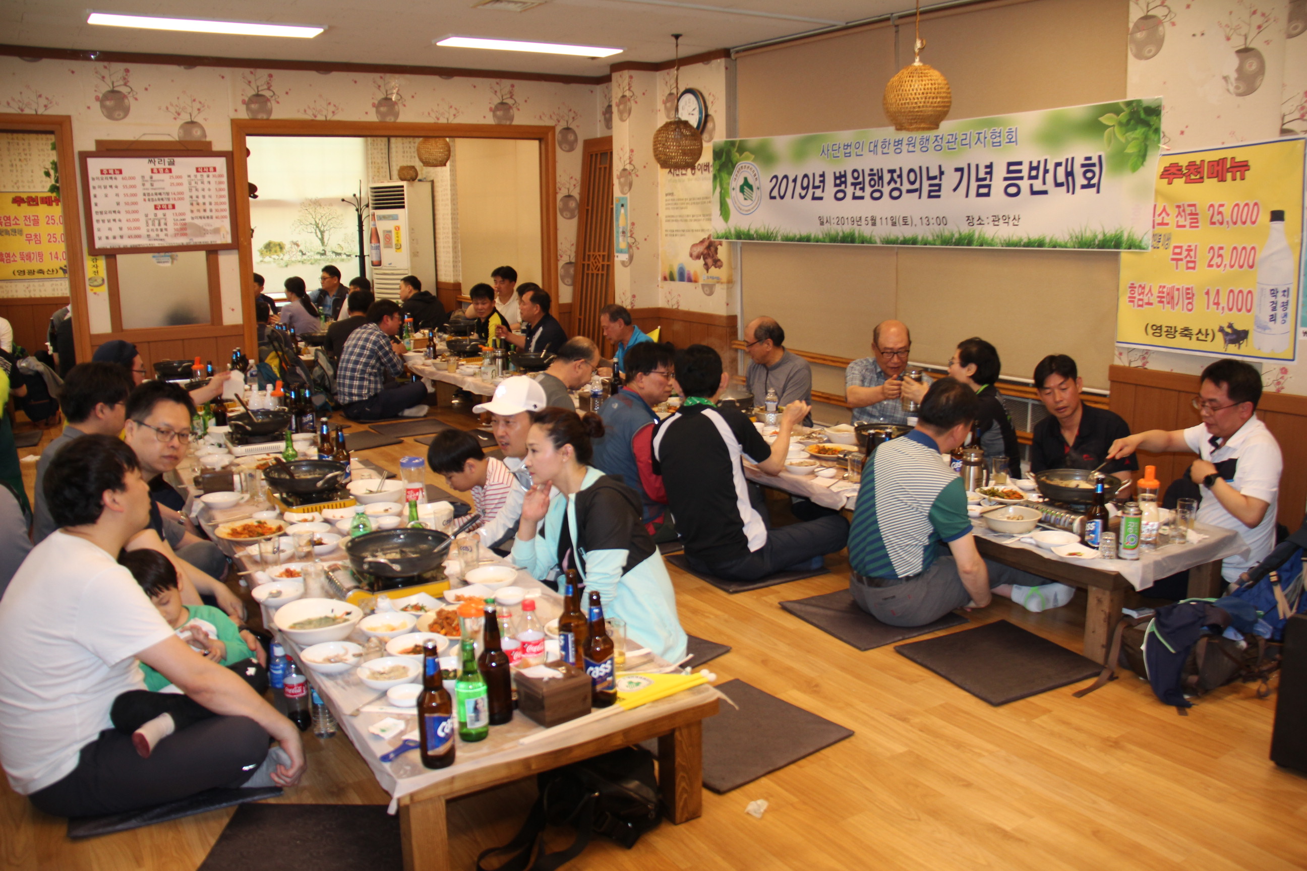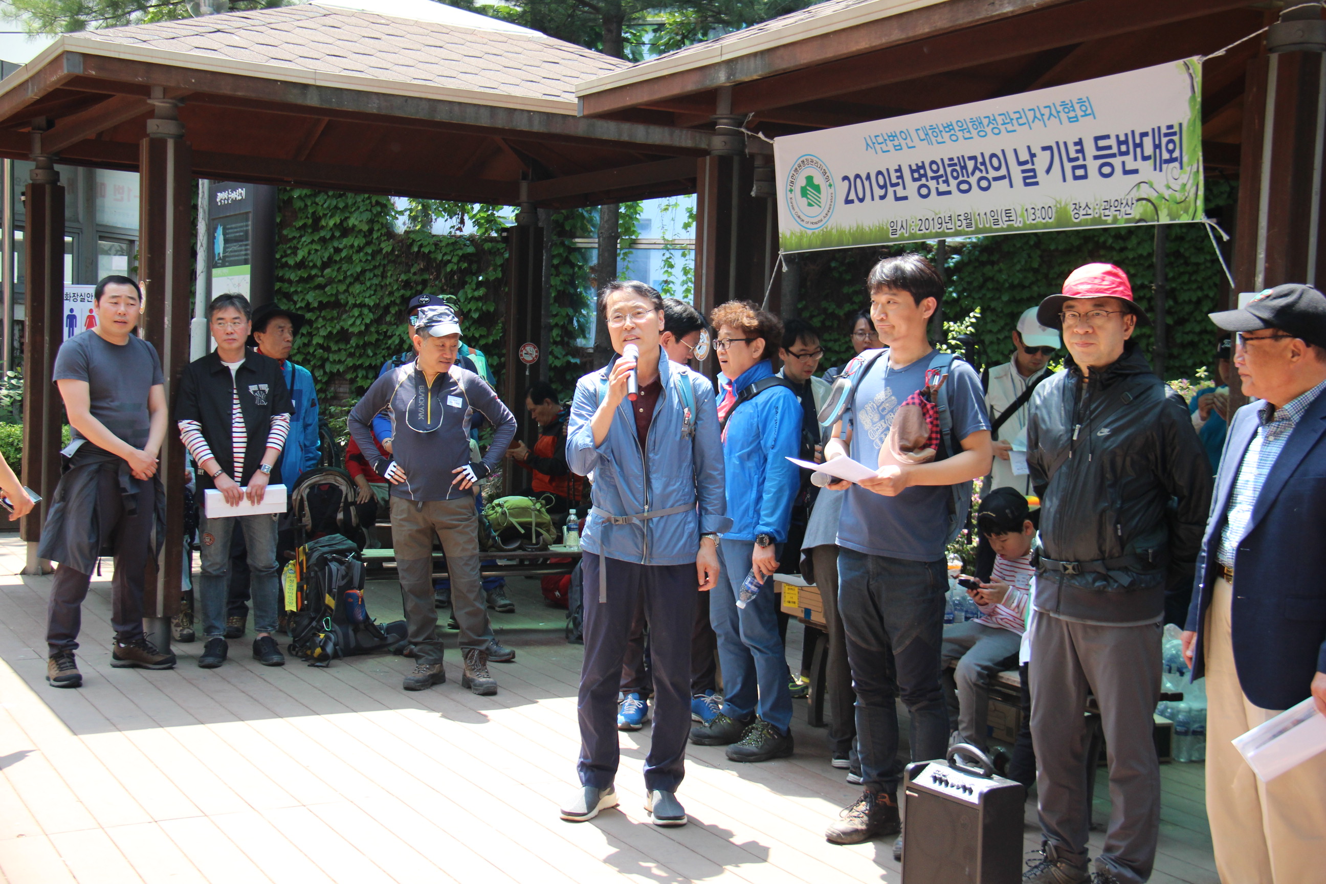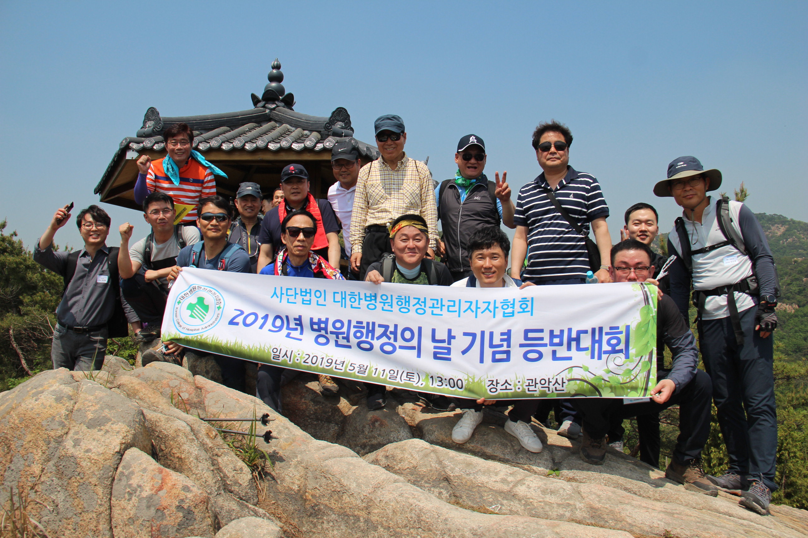 2019년 병원행정의 날 기념 등반대회를 5월 11일(토), 오후 1시부터 5시까지 관악산에서 개최하였다. 화창한 날씨와 선선한 바람이 함께한 이번 등반대회는 전국 18개 시‧도회 회원 및 가족 등 200여명이 참석하여 단합된 협회와 소통하는 협회의 모습을 보여주는 자리였다. 정영권 협회장은 인사말을 통해서 “봄의 절정을 넘어가는 오늘, 병원행정의 날 기념 등반대회에 참석하여주신 모든 분들께 감사를 드린다. 선배님들과 동료 여러분들 덕분에 하늘마저 좋은 날씨를 주신 것 같다. 오늘 산행이 한동안 왕래가 뜸했던 회원들이 마음속에 담고 있는 많은 이야기를 나눌 수 있는 소통의 자리 되기를 바라며, 서로에게 수고했다고 다독여주는 소중한 자리가 되기를 기원한다. 끝나는 시간까지 부상 없이 행복한 시간을 보내시길 바라며, 다시 한번 참석하여 주셔서 감사드린다.”라고 전하였다. 또한 등반대장 김인철 서울특별시회장은 등반일정과 유의사항을 소개하고, 관악산으로 회원들을 이끌었다. 이날 등반은 관악역 2번출구에서 출발하여 → 산막사 사거리 → 전망바위 → 학우봉 중턱 → 안양사 → 안양예술공원 → 만찬장소(싸리골)으로 돌아오는 1시간 30분의 보통수준의 코스로 구성하였으며, 등반 후 만찬장소에서는 저녁식사와 함께 이필복 서울특별시회 사무국장이 레크레이션을 진행하며 모두가 즐거운 시간을 보냈고, 회원 모두 단합된 협회 만들자고 다짐하며 행사를 마무리 하였다.
