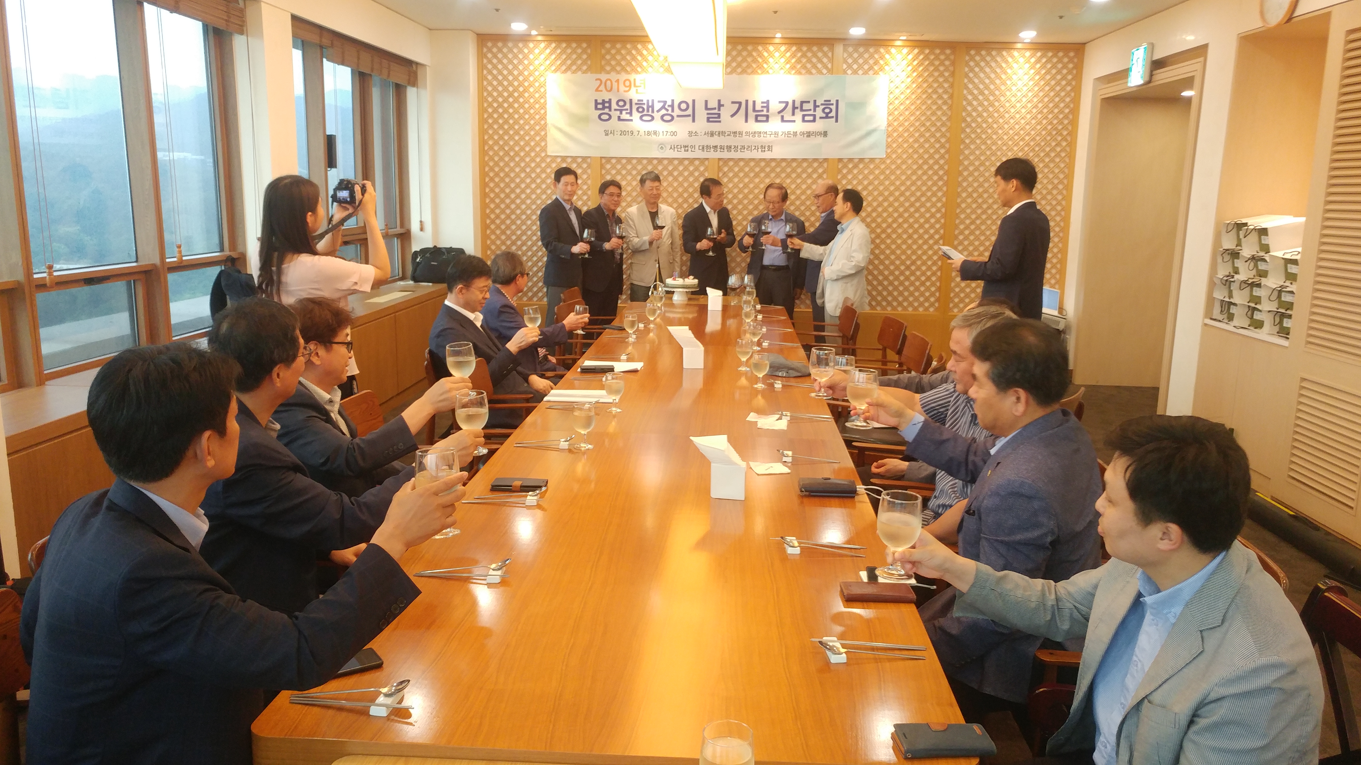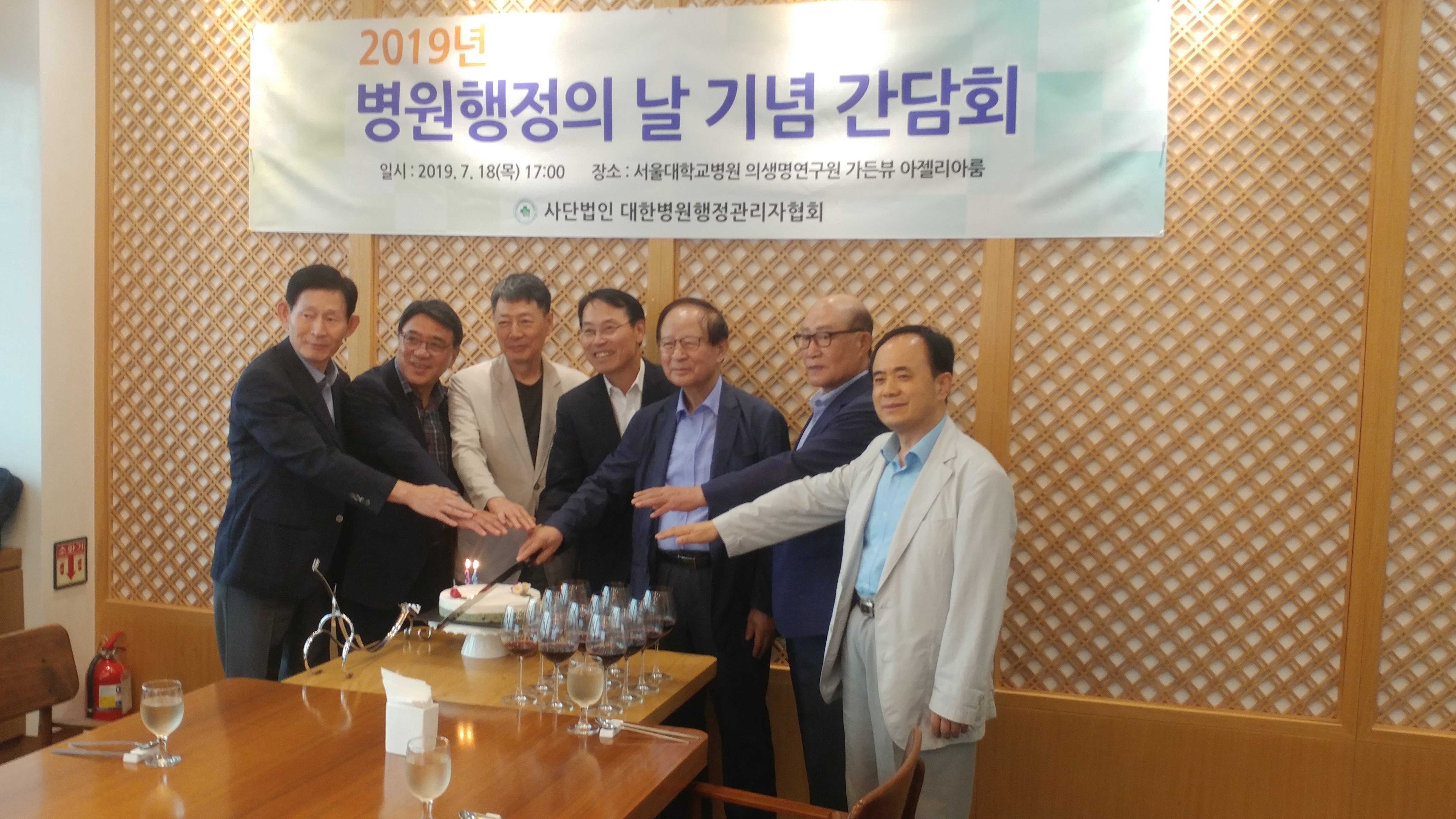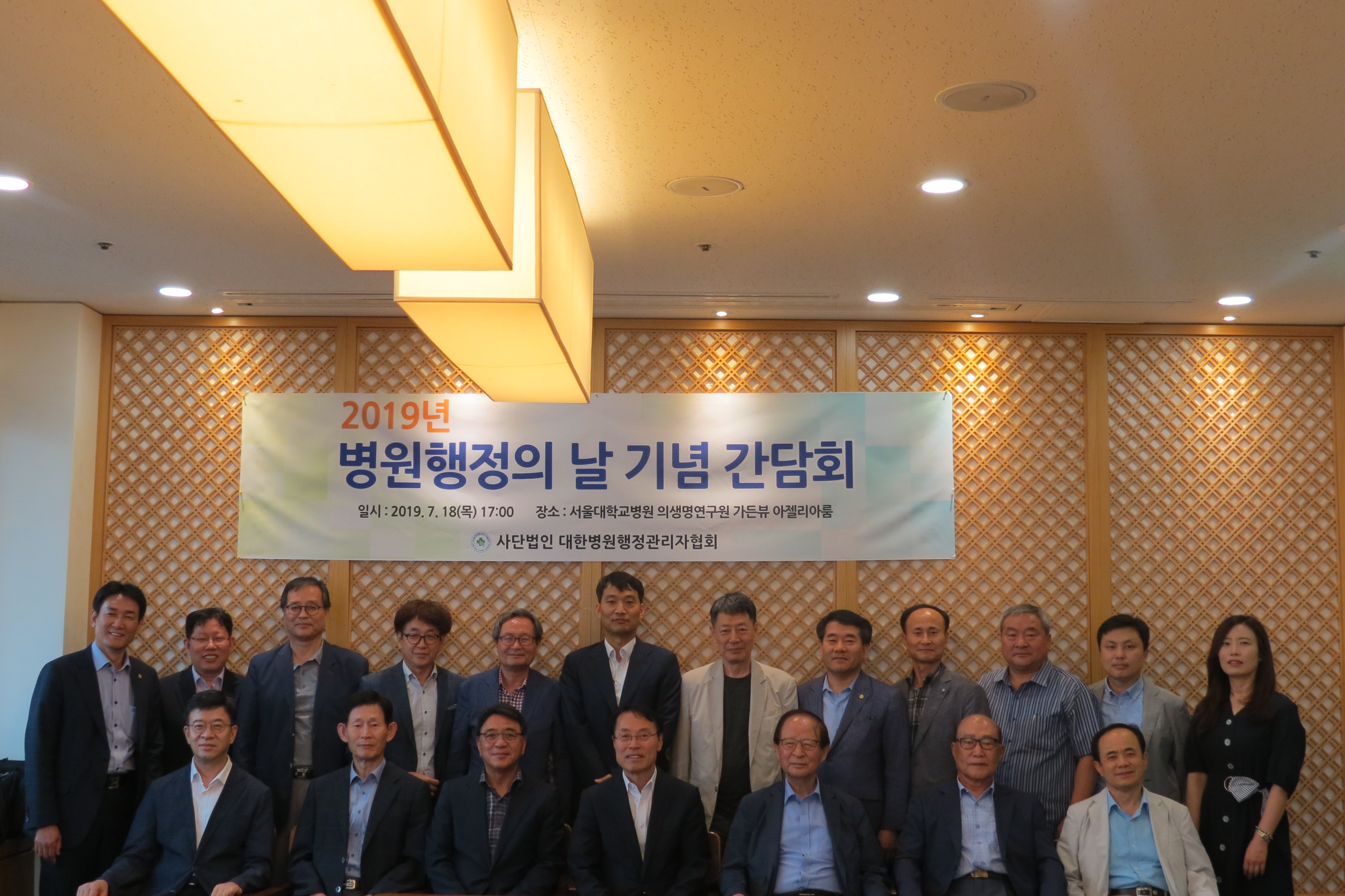 병원행정의 날 기념 간담회가 7월18일(목), 오후5시 서울대학교병원 의생명연구원 11층 가든뷰 아젤리아룸에서 개최 되었다. 정영권 협회장은 인사말을 통해 “협회의 34번째 생일을 축하하는 자리에 바쁘신 가운데에도 참석하여주신 명예회장님과 상임고문님, 고문님과 협회 임원분들께 진심으로 감사드린다. 우리 협회가 병원행정을 대표하는 단체로서 굳건히 자리매김해 올 수 있었던 것은, 여기 계신 선배님들과 동료들이 한 마음 한 뜻으로 사심 없이 협회의 발전을 위해 노력해 왔기 때문이다. 오늘 이 자리를 통해 34년의 협회를 축하하고 미래를 위해 고민하는 소중한 시간이 되기를 바란다.”고 밝혔다. 이날 간담회는 정영권 협회장, 이종길·김태웅·박영익 명예회장, 정동선 상임고문, 송영채·윤호건 고문, 박병태·김인철·안병남·강성태·이은규·강창렬·신광수 부회장, 김재선 미래발전위원장, 박종택·홍성삼 감사, 이은제 교육부원장 등이 참석하였고, 지난 시간을 돌이켜보며 협회가 더욱 발전할 수 있는 방안과 우리협회를 중심으로 병원행정인들이 단합과 소통할 수 있도록 상호 덕담이 오고갔다.